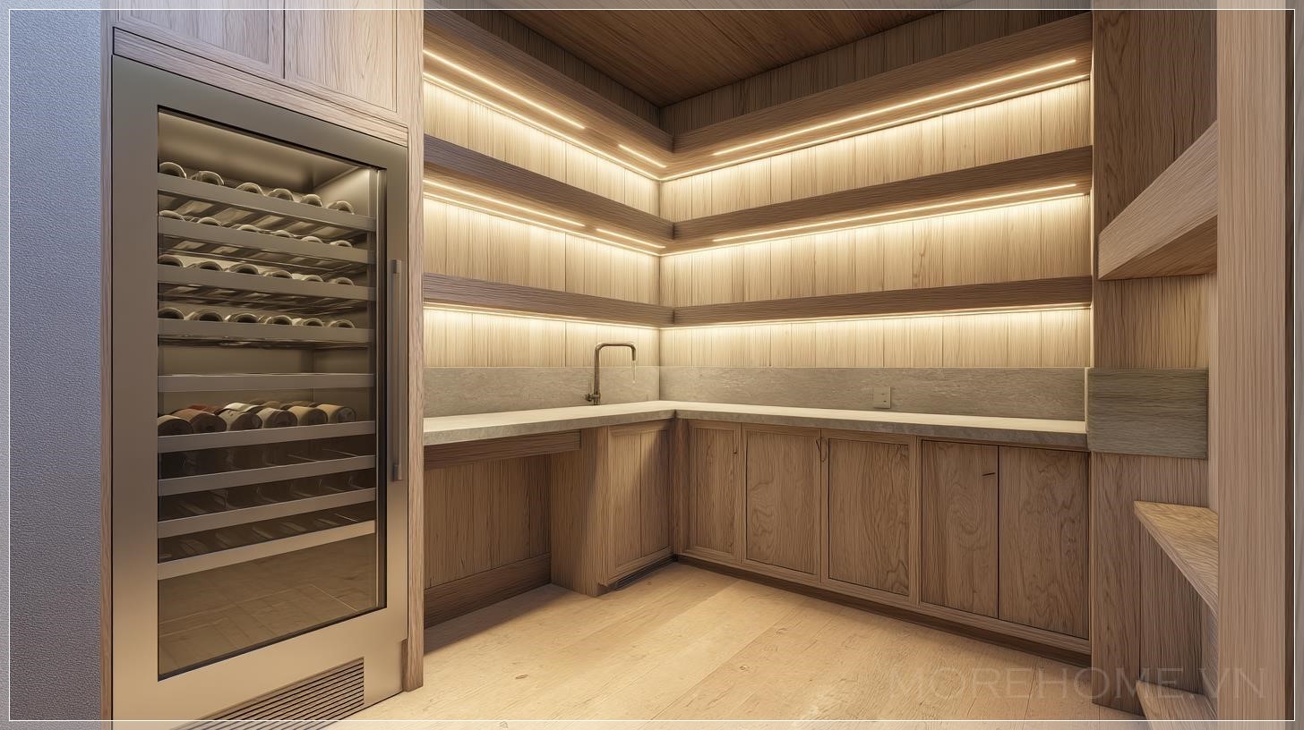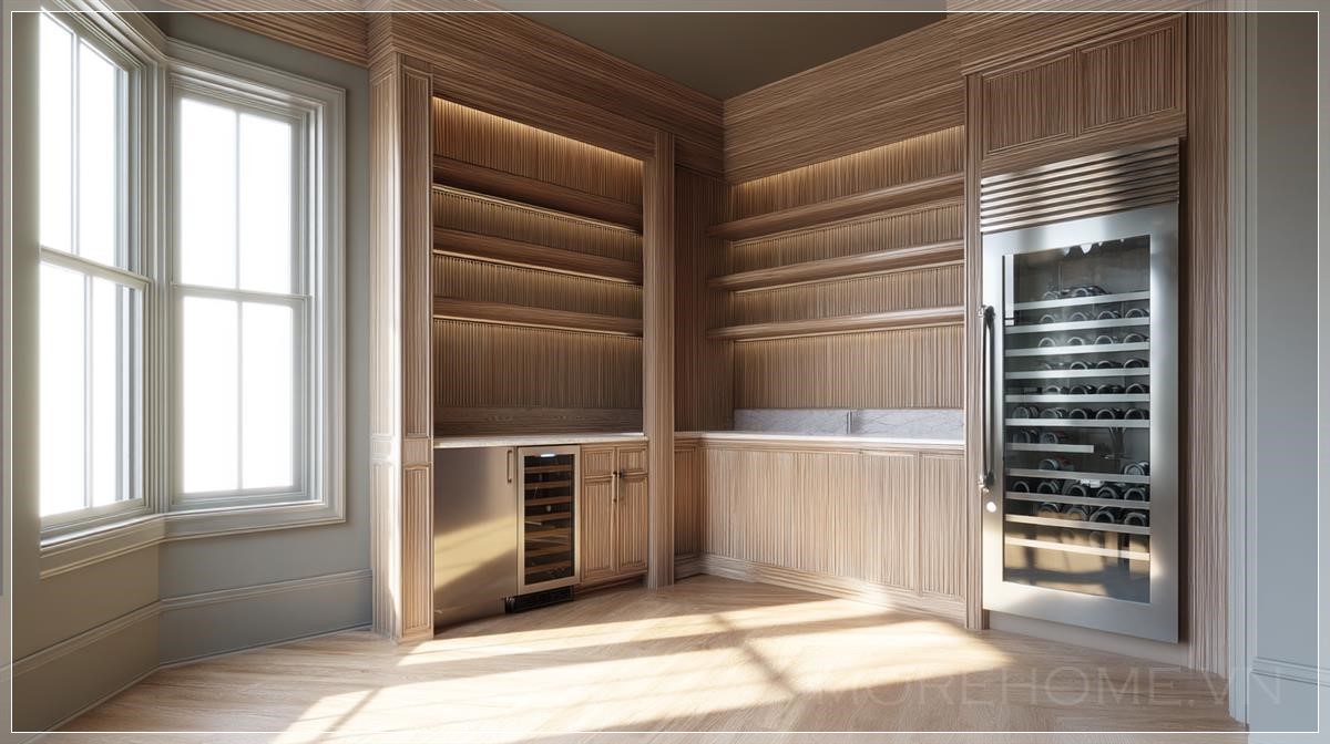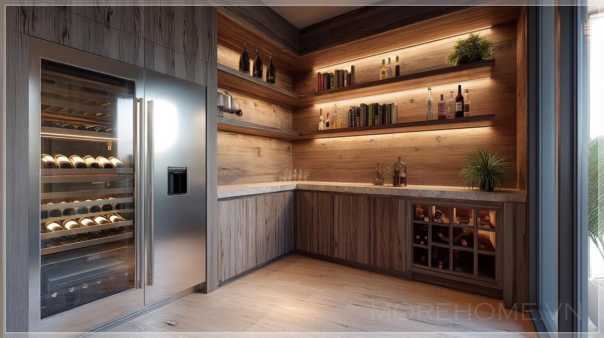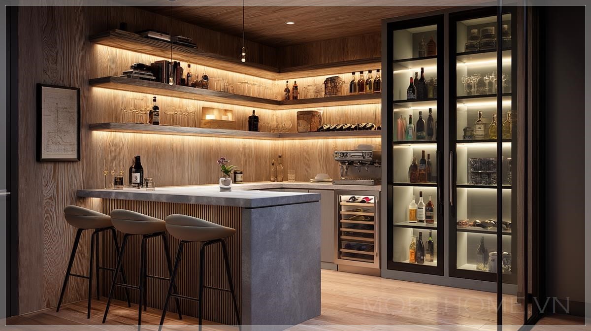 Mô phỏng 3D của một góc trống được bài trí như một quầy bar cao cấp trong nhà với tường ốp gỗ, kệ chiếu sáng dưới, tủ rượu tích hợp và các chi tiết kim loại. Sự tinh tế nhẹ nhàng.