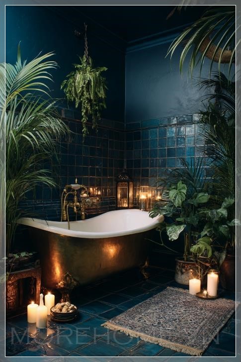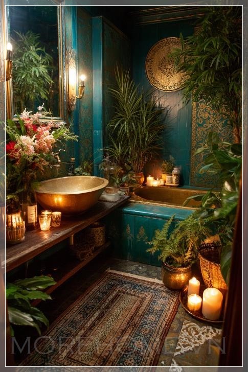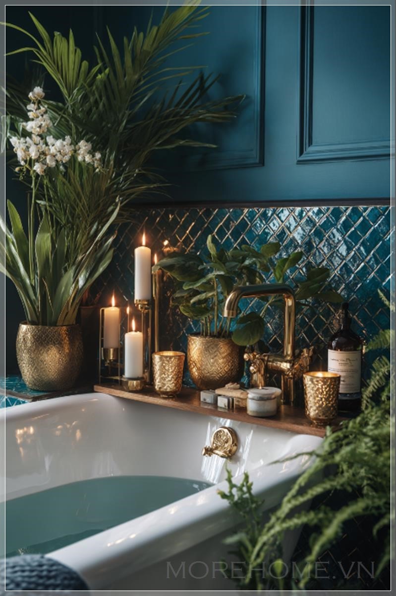 Trong không gian phòng tắm Bohemian này, màu xanh ngọc bích đen hòa quyện với ánh vàng óng ánh, tạo nên một cảm giác huyền bí nhưng vẫn đầy ấm áp và gần gũi. Sự kết hợp giữa ánh sáng vàng nhẹ từ các ngọn nến và màu sắc của gạch lát sàn sáng bóng tạo ra một không gian thư giãn tuyệt vời. Những chiếc cây xanh tươi mát được đặt ở các góc phòng, tạo ra một bầu không khí sinh động, gợi lên cảm giác như đang ở giữa thiên nhiên.