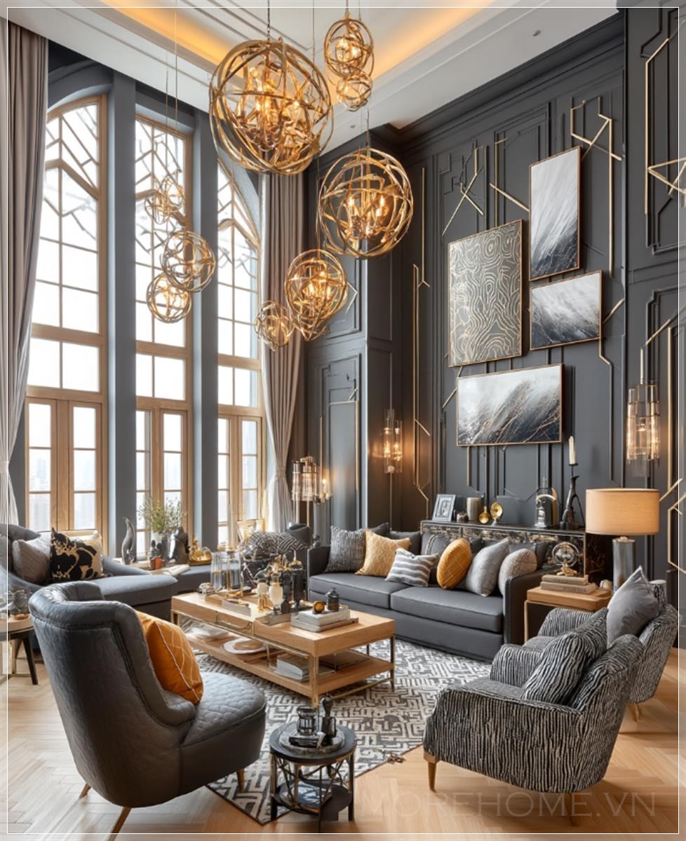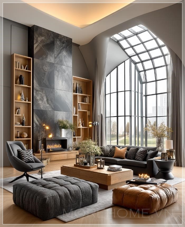 Với không gian phòng khách của một ngôi nhà đơn lập, những chiếc ghế sofa kiểu Mỹ được bọc vải có kết cấu nổi bật, tạo nên sự dễ chịu và cao cấp. Mỗi chi tiết, từ các đường nét đến chất liệu, đều được chọn lọc kỹ lưỡng, phản ánh rõ nét sự xa hoa và tinh tế trong từng khung hình. Đặc biệt, cửa sổ từ sàn đến trần cho phép ánh sáng tự nhiên tràn vào, làm nổi bật không gian sống sang trọng này.
