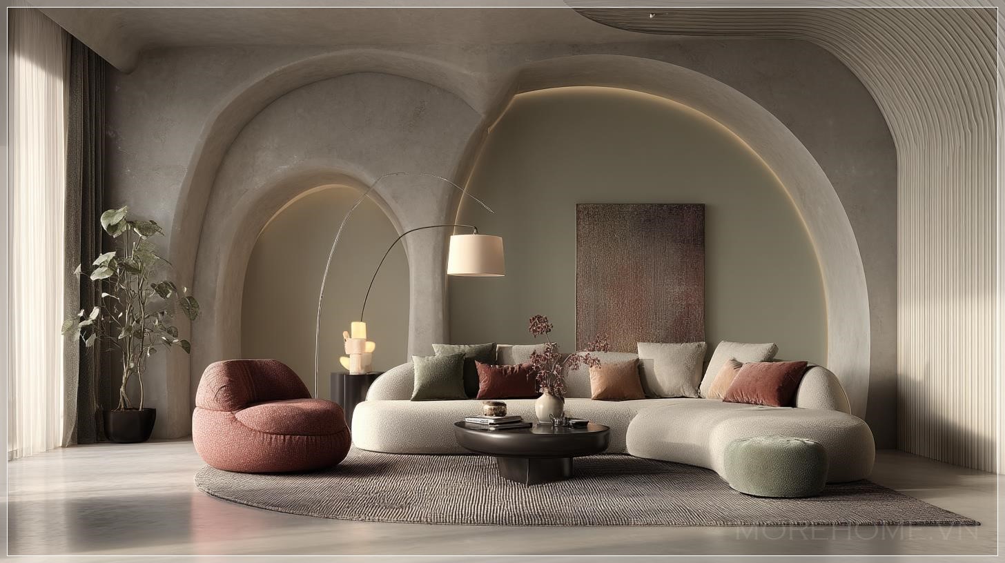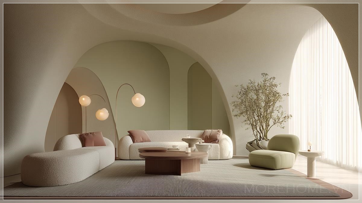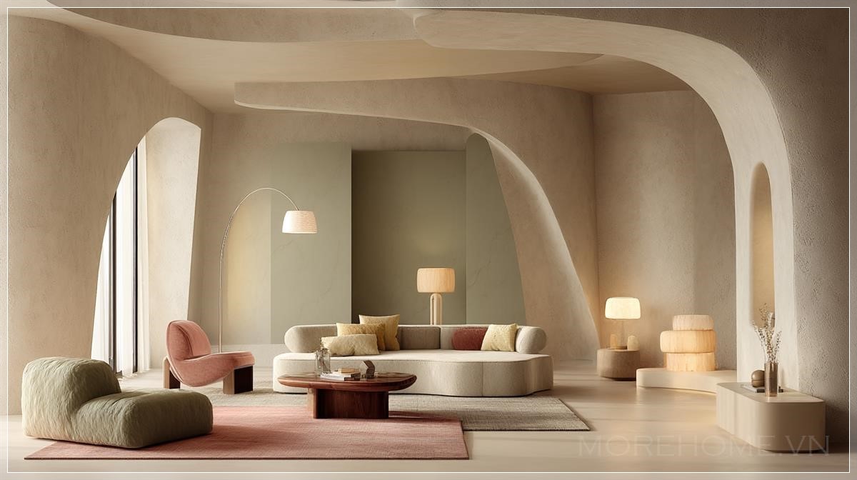 Phong cách thiết kế này không chỉ nổi bật với những hình khối mềm mại và mượt mà, mà còn khéo léo kết hợp các yếu tố deconstructed để tạo ra một không gian sống hiện đại, thanh thoát. Mỗi chi tiết, từ màu sắc đến ánh sáng, đều góp phần tạo nên một không gian sống đầy cảm hứng, nơi mọi góc nhìn đều toát lên sự tinh tế và tính nghệ thuật cao.