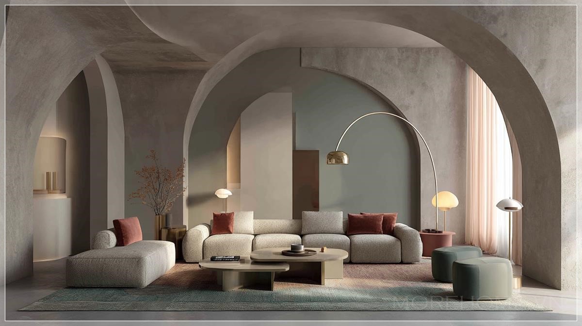 Trong không gian phòng khách này, những bức tường cong deconstructed được thiết kế với tông màu xám-beige Morandi mềm mại, mang đến cảm giác ấm áp và thư giãn. Các đường cong tinh tế, lấy cảm hứng từ Zaha Hadid, tạo nên những hình dạng hữu cơ đầy tính nghệ thuật, khiến căn phòng trở nên độc đáo và cuốn hút. Những bề mặt sạch sẽ và tinh tế, kết hợp với các loại vải có kết cấu ấm áp, tạo nên sự cân bằng hoàn hảo giữa vẻ đẹp hiện đại và cảm giác thoải mái.