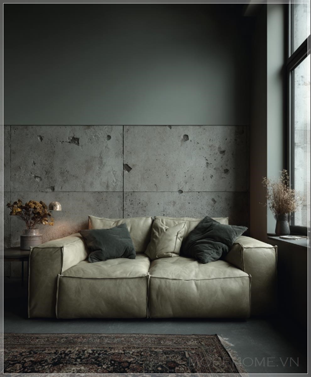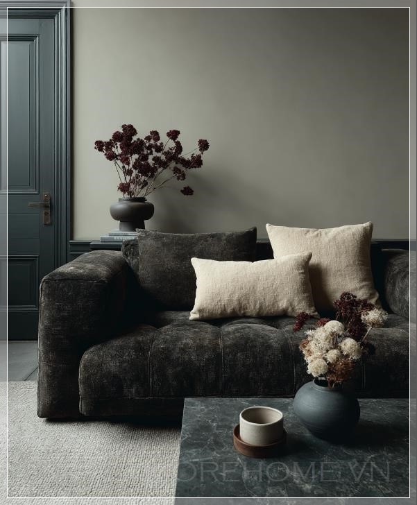 Phòng khách tối giản với bộ sofa thanh lịch, chiếc bàn cà phê đặt gọn gàng giữa không gian, tạo nên một điểm nhấn tinh tế trong một không gian mở. Tường được sơn màu be đất nhẹ nhàng, mang lại cảm giác ấm cúng và dễ chịu. Màu sắc nhẹ nhàng của tường như làm nổi bật sự tối giản của các đồ nội thất, nơi mà từng chi tiết đều có ý nghĩa và được chọn lọc tỉ mỉ.
