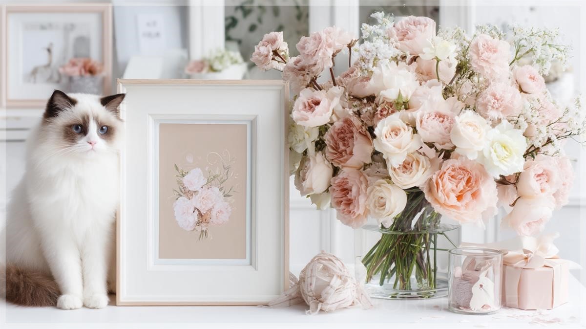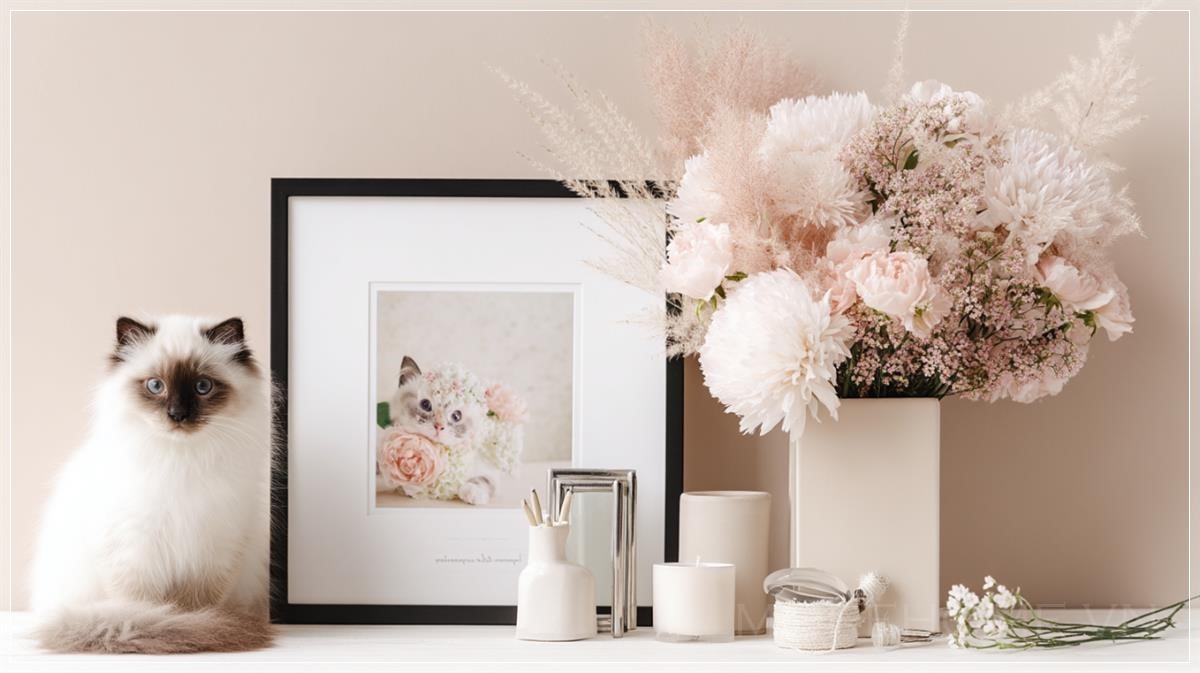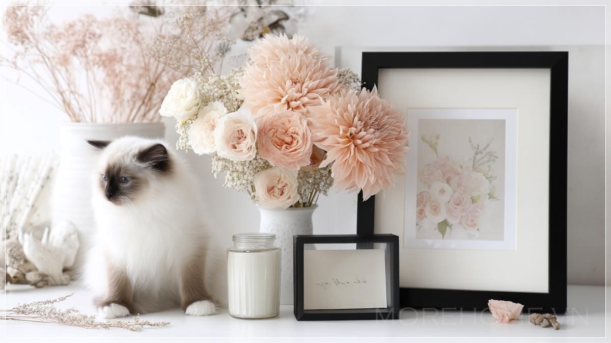 Ngay bên cạnh bức ảnh, một chú mèo Ragdoll xinh xắn, với bộ lông dài và mượt mà, tạo nên một điểm nhấn mềm mại và dễ thương. Chú mèo hai màu, với sự kết hợp tinh tế của những gam màu sáng và tối, đem lại cảm giác nhẹ nhàng, dễ chịu, đồng thời là người bạn đồng hành đầy yêu thương trong không gian này.