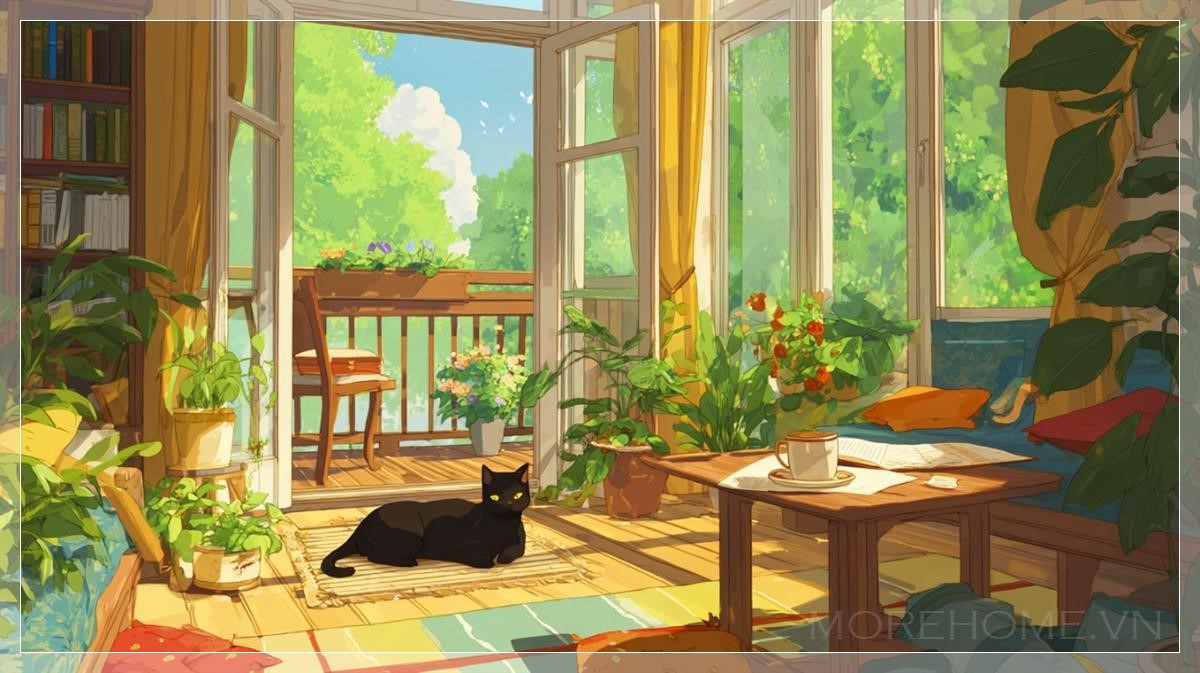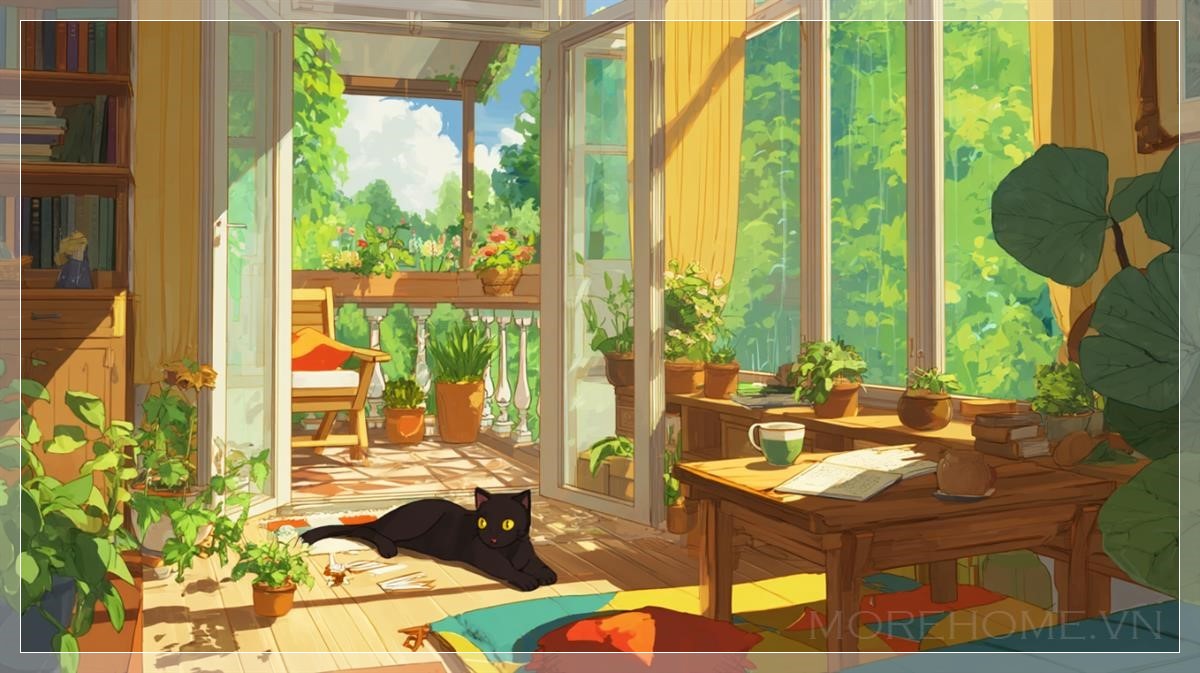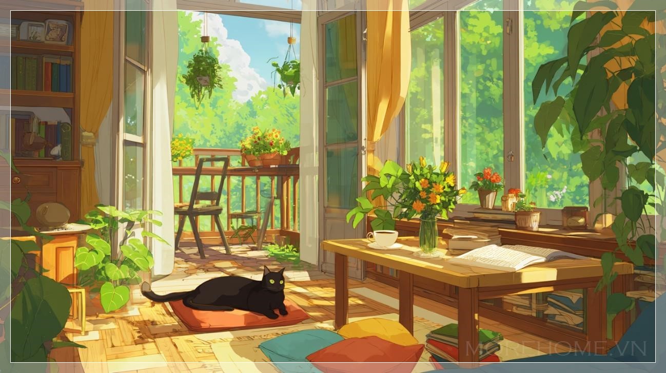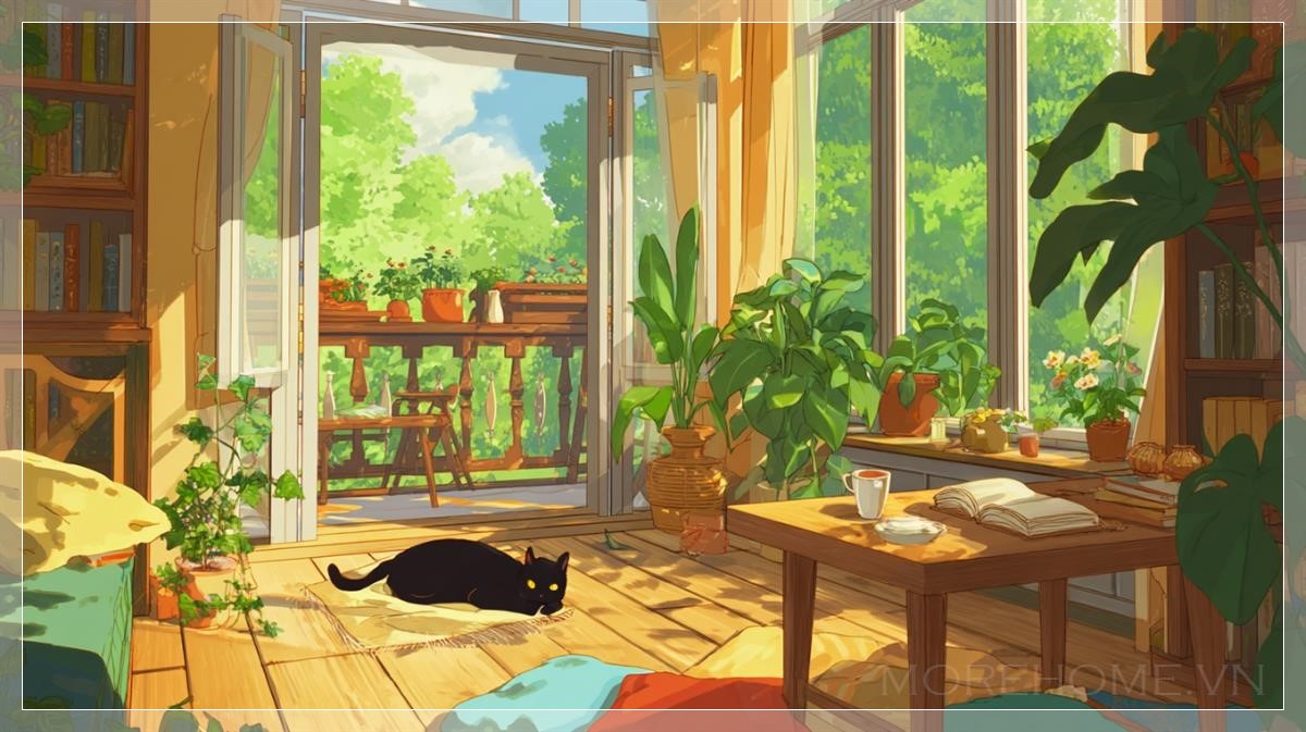 Trong một căn phòng ấm áp tràn ngập ánh sáng mặt trời, mọi chi tiết dường như được vẽ bằng nét bút anime đầy trìu mến và tinh tế. Những tia nắng vàng óng rót qua khung cửa sổ lớn, trải dài trên nền gỗ bóng mịn, len lỏi qua từng kẽ lá của những chậu cây xanh mướt đặt khắp không gian. Ánh sáng chan hòa ấy không chỉ làm nổi bật đường vân của chiếc bàn gỗ, mà còn làm những chiếc gối nhiều màu sắc trên ghế sofa như rực rỡ hơn dưới lớp ánh sáng dịu dàng.