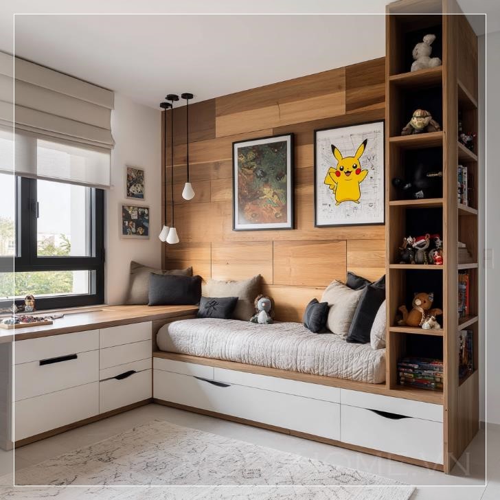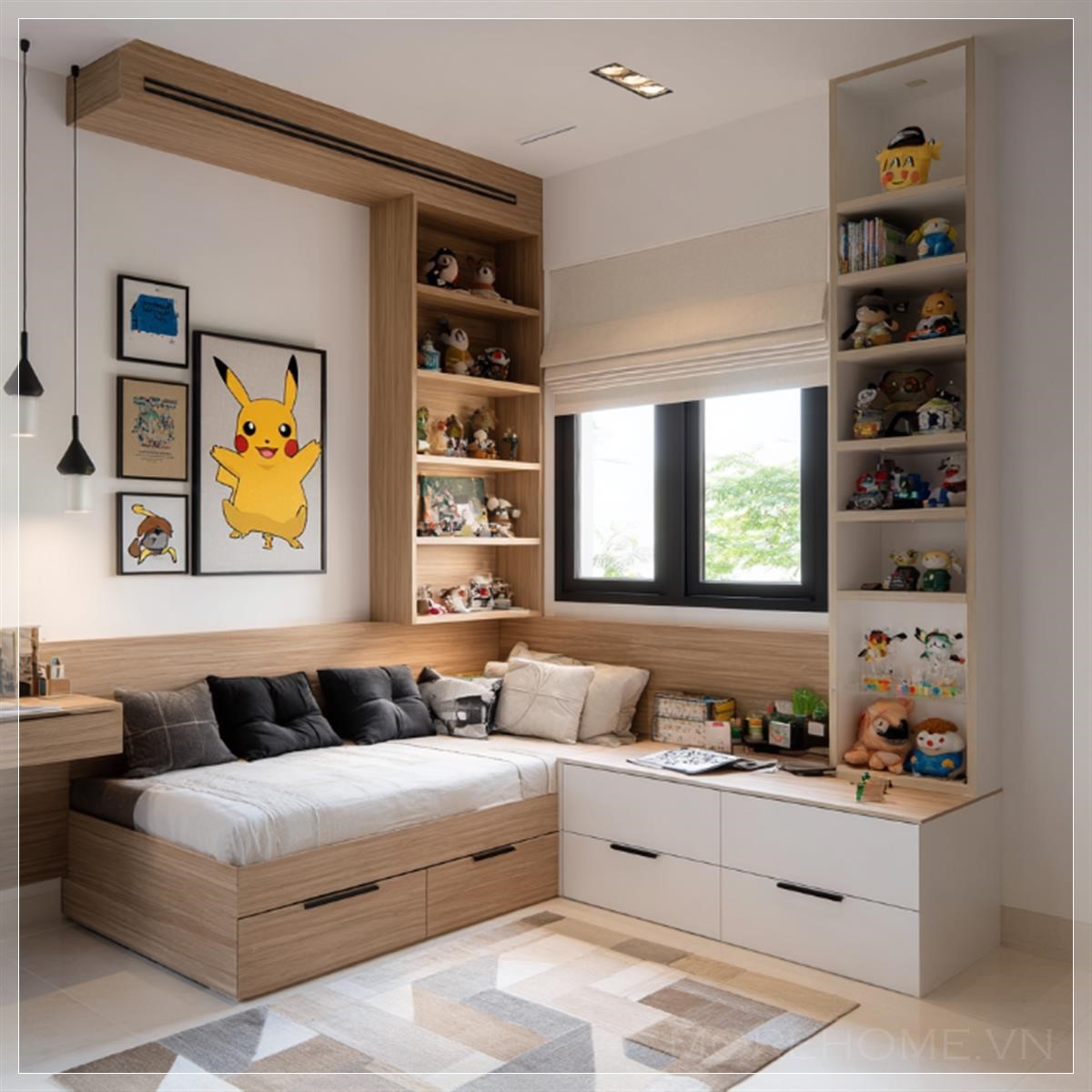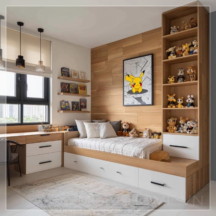 Thiết kế giường tích hợp sử dụng khung gỗ tự nhiên kết hợp mặt ngăn kéo trắng, tạo nên sự hài hòa đồng bộ với tổng thể căn phòng. Xung quanh khu vực giường là hệ tủ kệ được thiết kế liền khối, cung cấp nhiều không gian trưng bày các mô hình Pokemon, thú nhồi bông và tranh ảnh nhân vật hoạt hình. Trong đó, nổi bật là bức tranh Pikachu vui nhộn – điểm nhấn đáng yêu mang lại nét trẻ thơ nhưng vẫn giữ được tinh thần thẩm mỹ chung.
