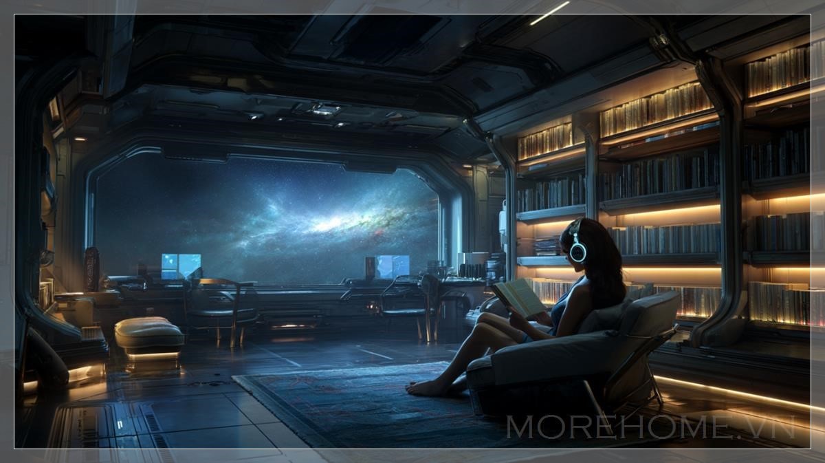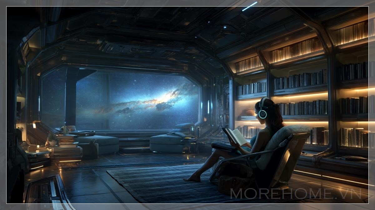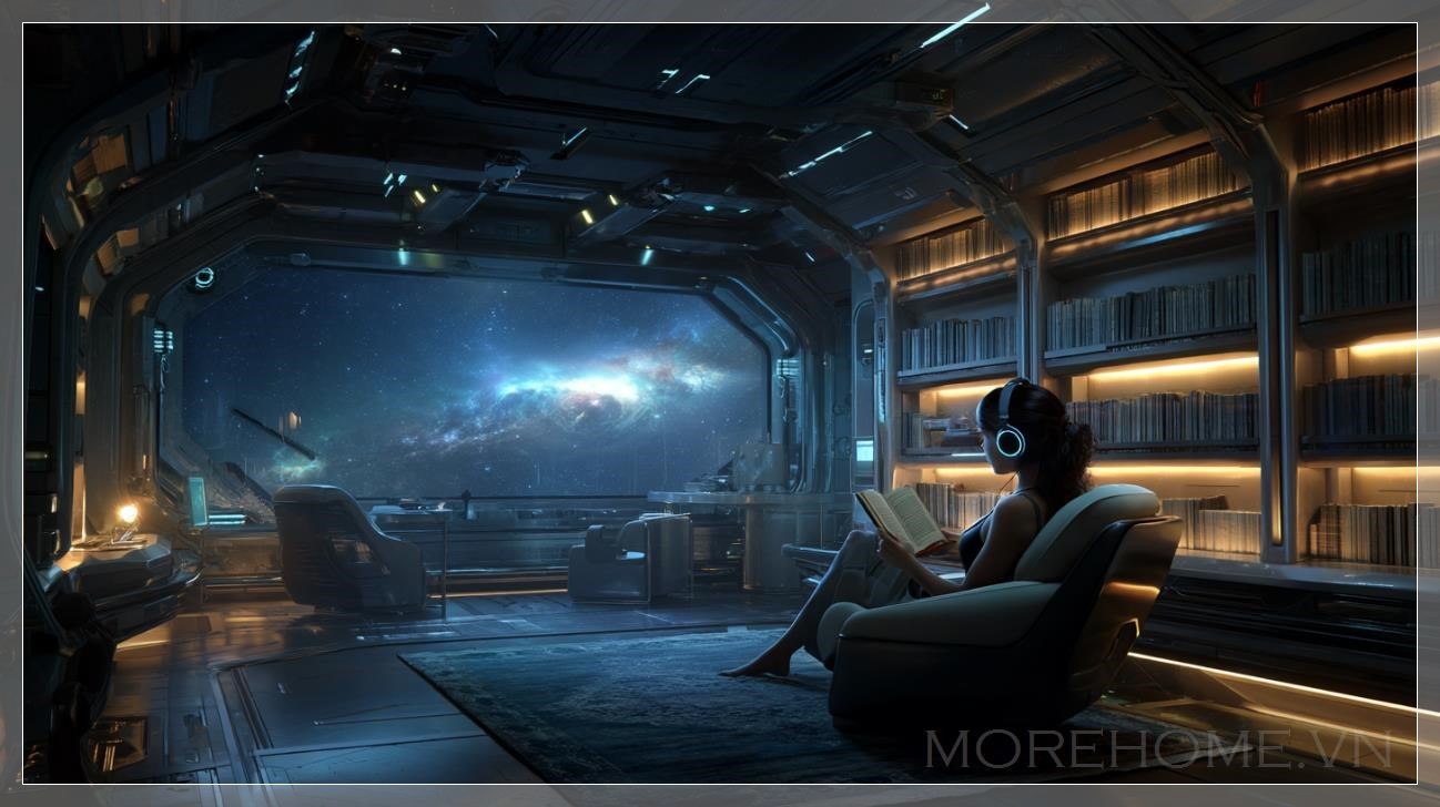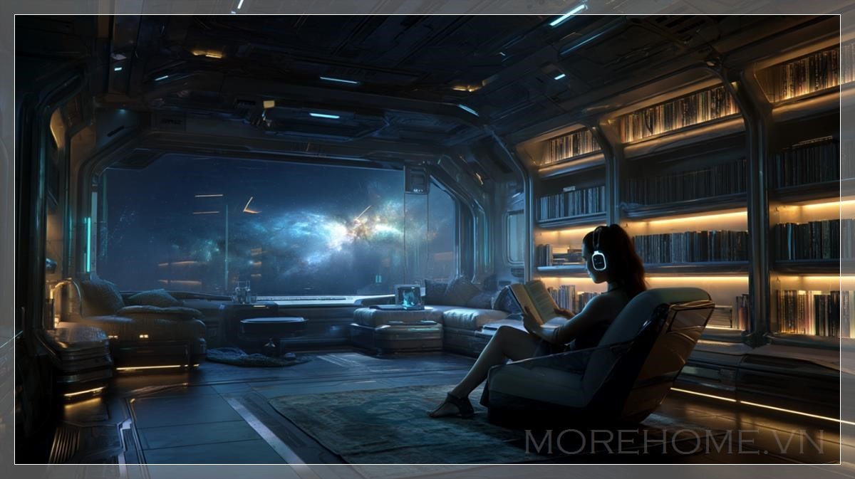Trong không gian tĩnh lặng của một tàu vũ trụ, nơi ánh sáng dịu dàng của một ngôi sao xa chiếu sáng qua cửa sổ lớn, một không gian học tập yên bình được hình thành. Được bao bọc bởi những kệ sách tích hợp đầy ánh sáng phát sáng từ những cuốn sách, khu vực học tập này không chỉ là nơi để đọc mà còn là nơi tìm thấy sự yên tĩnh và thư giãn. Nổi bật trong không gian này là một người phụ nữ tóc nâu tuyệt đẹp, mặc trang phục tương lai và đeo tai nghe, cô ngồi thoải mái trong chiếc ghế bành mềm mại, tay cầm một cuốn sách.