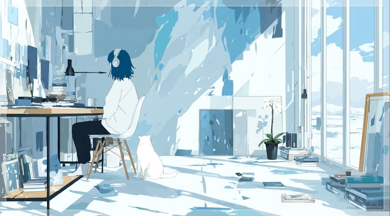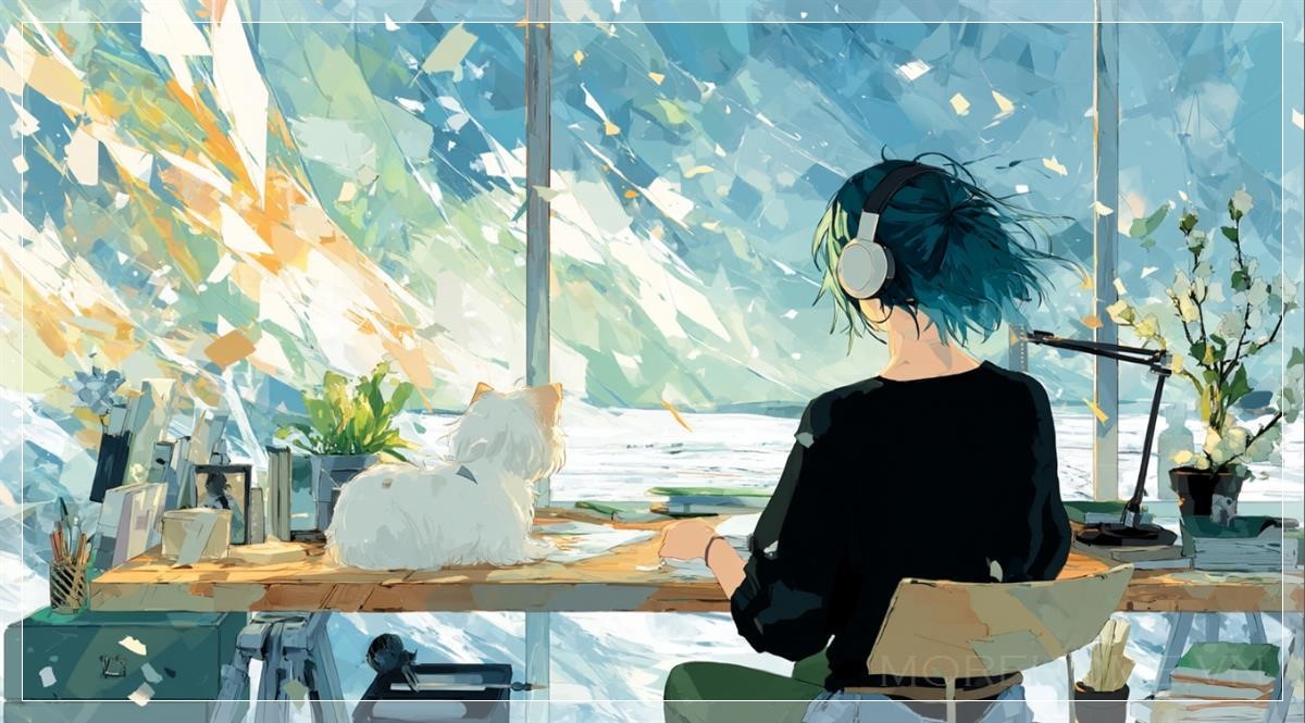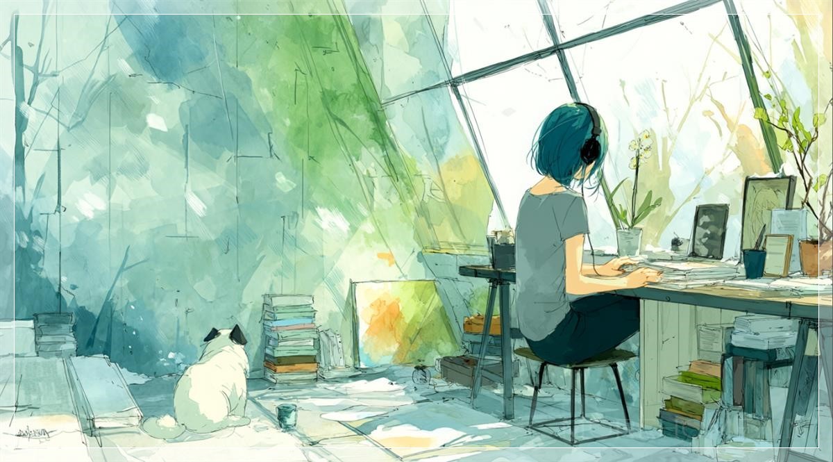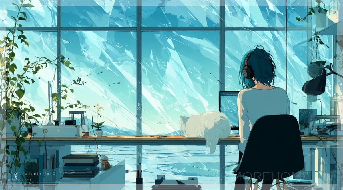 Ánh sáng mờ ảo xuyên qua khung cửa sổ lớn, chiếu những tia sáng nhẹ nhàng vào căn phòng tràn ngập không khí bình yên. Trong không gian ấy, cô gái tóc xanh ngồi chăm chú làm việc, những chiếc tai nghe màu đen nổi bật trên mái tóc của cô. Cô đắm chìm trong thế giới riêng của mình, nơi mỗi lần gõ bàn phím lại mang đến một nguồn cảm hứng mới mẻ.
