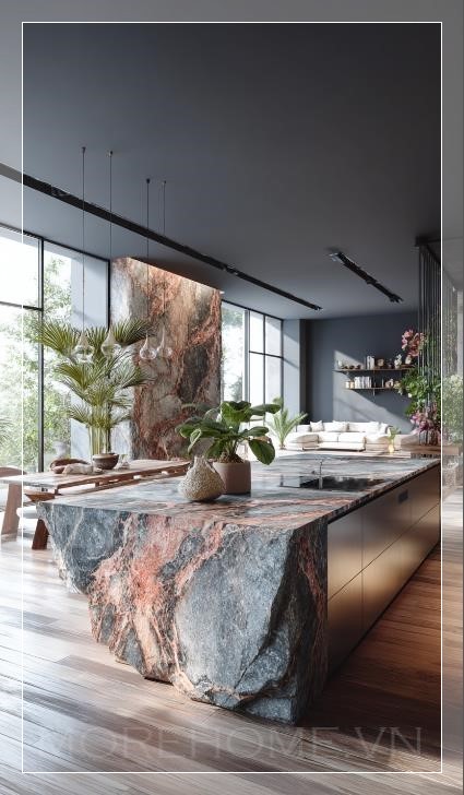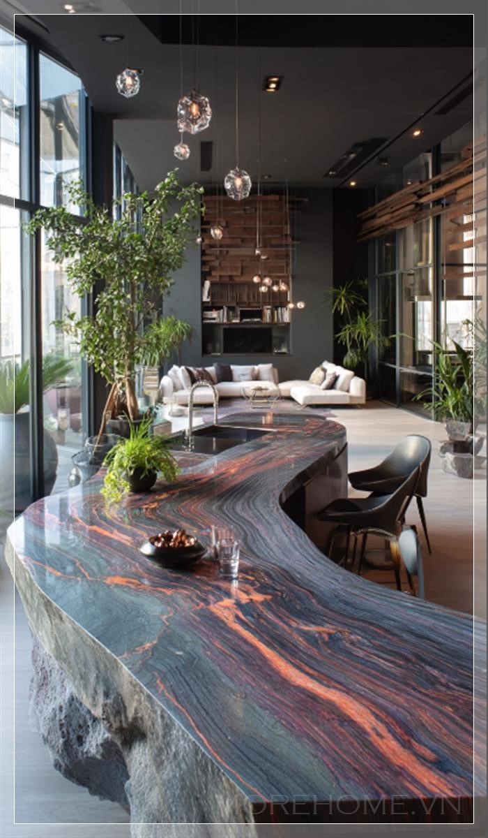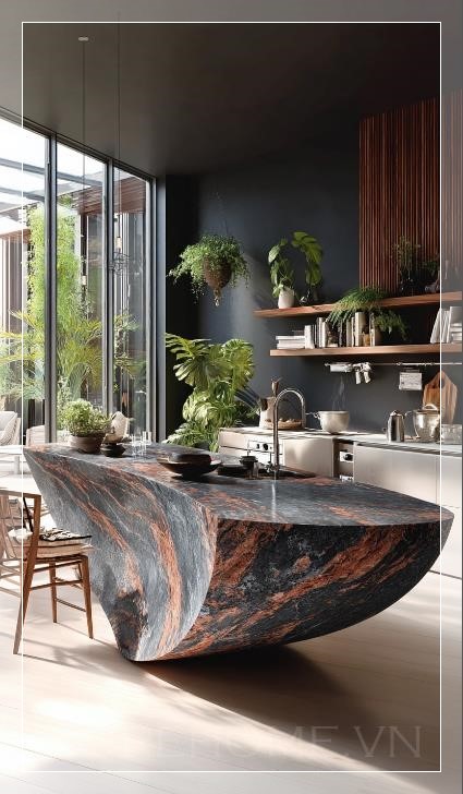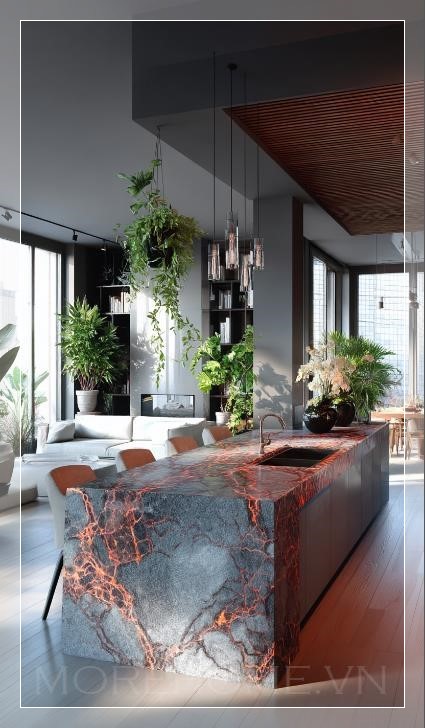 Trong không gian bếp hiện đại, một chiếc đảo bếp hình dáng hữu cơ nổi bật với màu sắc của đá cẩm thạch xám đen pha trộn cùng những vân đỏ rực rỡ, tạo nên một điểm nhấn đầy ấn tượng. Mặt bàn của đảo bếp được hoàn thiện bằng thép không gỉ sáng bóng, mang đến sự tương phản hoàn hảo với vẻ đẹp tự nhiên của đá cẩm thạch. Những vân màu cam tươi sáng vắt ngang trên bề mặt đá, tạo nên sự nổi bật và làm cho căn bếp trở nên sang trọng hơn bao giờ hết.