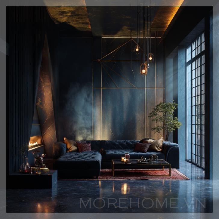 Với một phòng khách tối sang trọng như vậy, người ta có thể cảm nhận được sự thanh lịch trong từng chi tiết, từ những chiếc gối nhung mềm mại cho đến bộ rèm cửa tối màu, nhẹ nhàng vén lên để lộ ra những cửa sổ lớn, từ đó ánh sáng tự nhiên lọt vào, tạo ra sự tương phản thú vị giữa ánh sáng và bóng tối. Một không gian lý tưởng để tận hưởng sự bình yên, nhưng cũng đầy lôi cuốn, khơi dậy những cảm xúc và suy tư sâu sắc trong mỗi người khi bước vào.