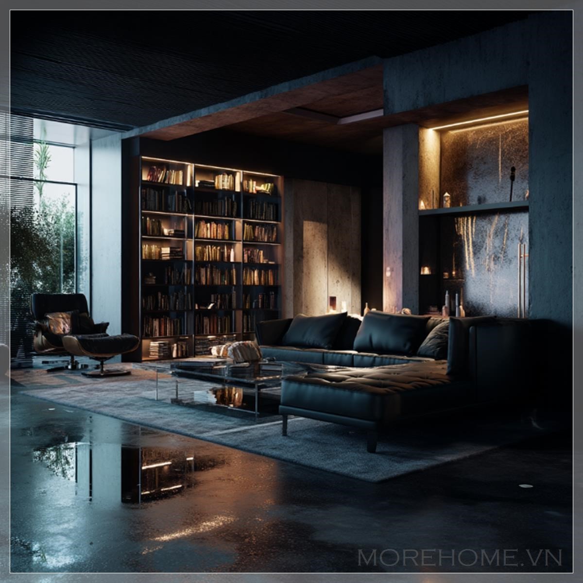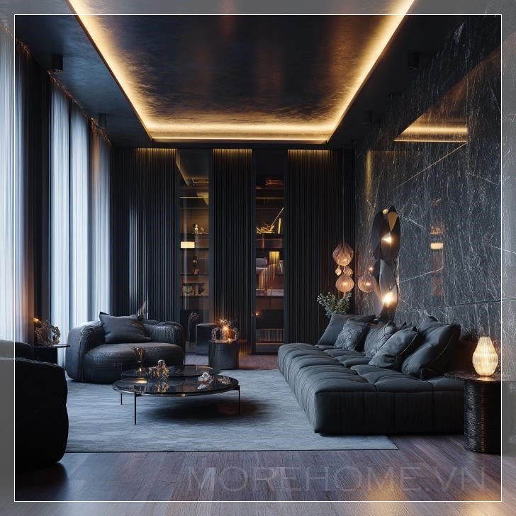 Đắm chìm trong không gian của một căn phòng tối sang trọng, nơi ánh sáng nhẹ nhàng chiếu rọi từ những nguồn sáng tinh tế, tạo ra một bầu không khí lôi cuốn và đầy cảm hứng. Những bức tường phủ lớp sơn đen tuyền, kết hợp với các món đồ nội thất tối màu, như ghế sofa bọc nhung đen mượt mà, mang đến cảm giác vừa hiện đại, vừa huyền bí. Không gian này như một bức tranh sống động, nơi ánh sáng và bóng tối cùng hòa quyện để tạo ra một không gian thư giãn đầy sang trọng.