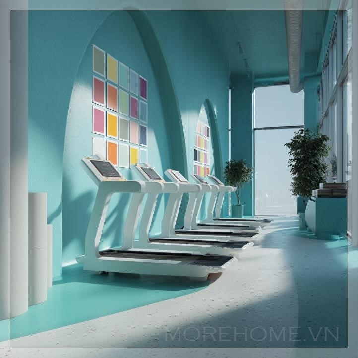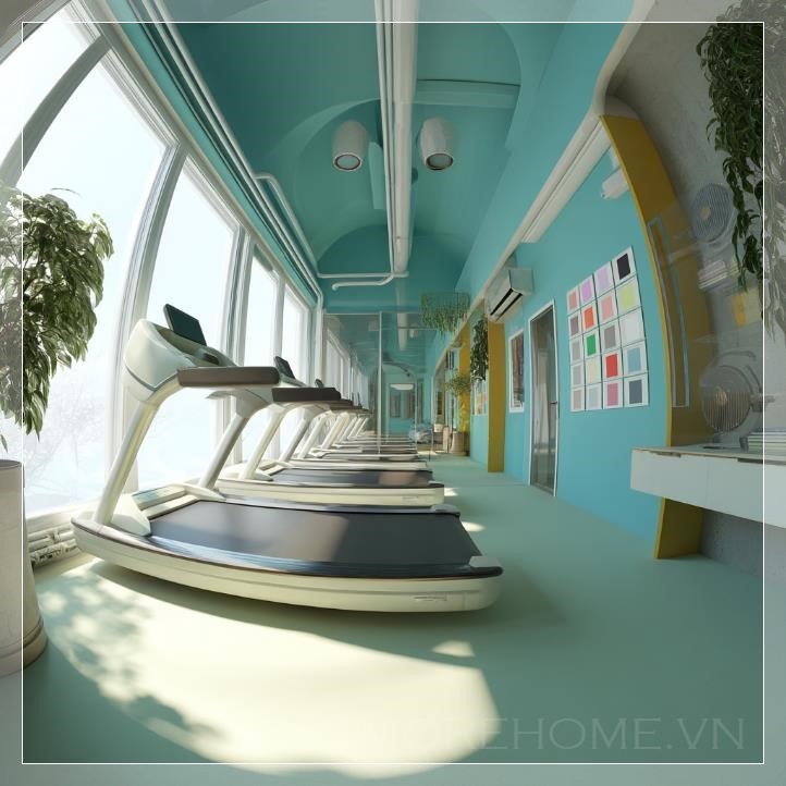 Với một góc nhìn rộng mở, căn phòng gym hiện đại này là sự kết hợp hoàn hảo giữa thiết kế tối giản và không gian sống động. Những chiếc máy chạy bộ xếp hàng cạnh nhau, mỗi chiếc đều nổi bật trong sắc xanh mát và trắng tinh khôi. Được bao quanh bởi một không gian rộng rãi, nơi ánh sáng tự nhiên ùa vào qua những ô cửa kính lớn, tạo ra một không gian đầy sức sống và tươi mới.